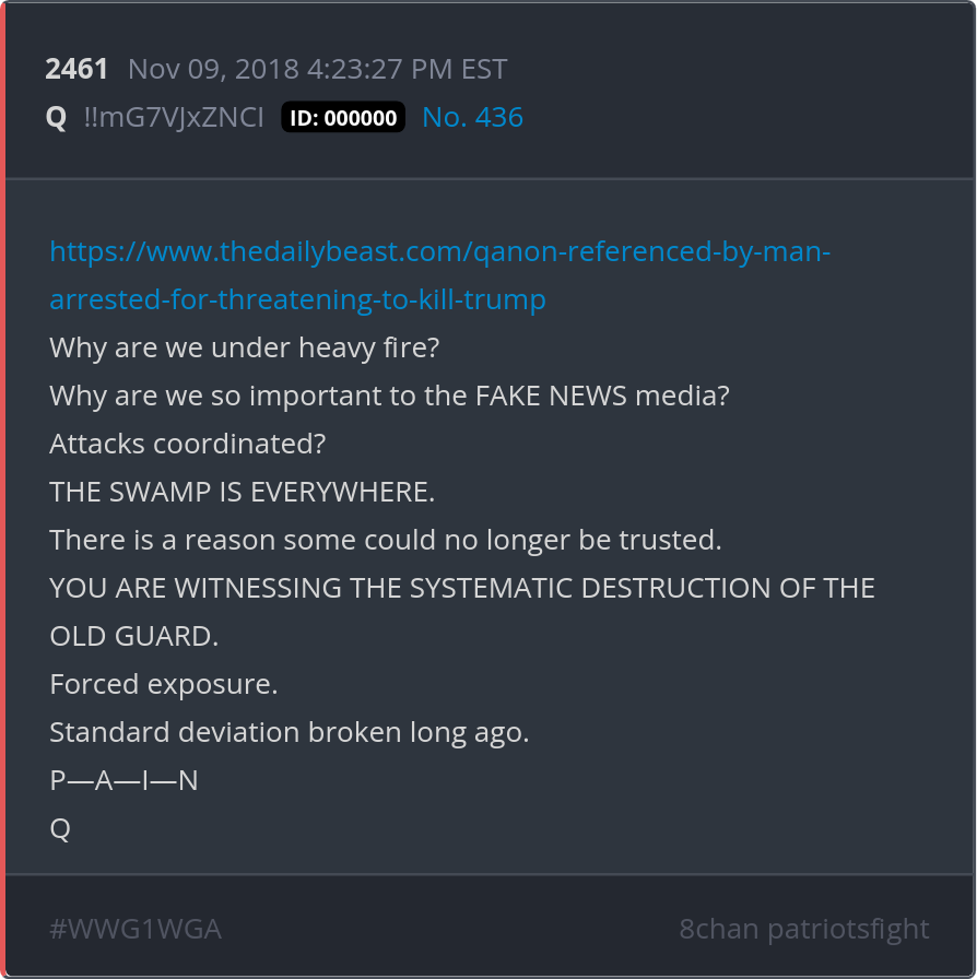 YOU ARE WITNESSING THE SYSTEMATIC DESTRUCTION OF THE OLD GUARD. Forced exposure. Standard deviation broken long ago. P—A—I—N https://www.thedailybeast.com/qanon-referenced-by-man-arrested-for-threatening-to-kill-trump Posted 11/08/2025 07:59 PM Categories Clips, Q