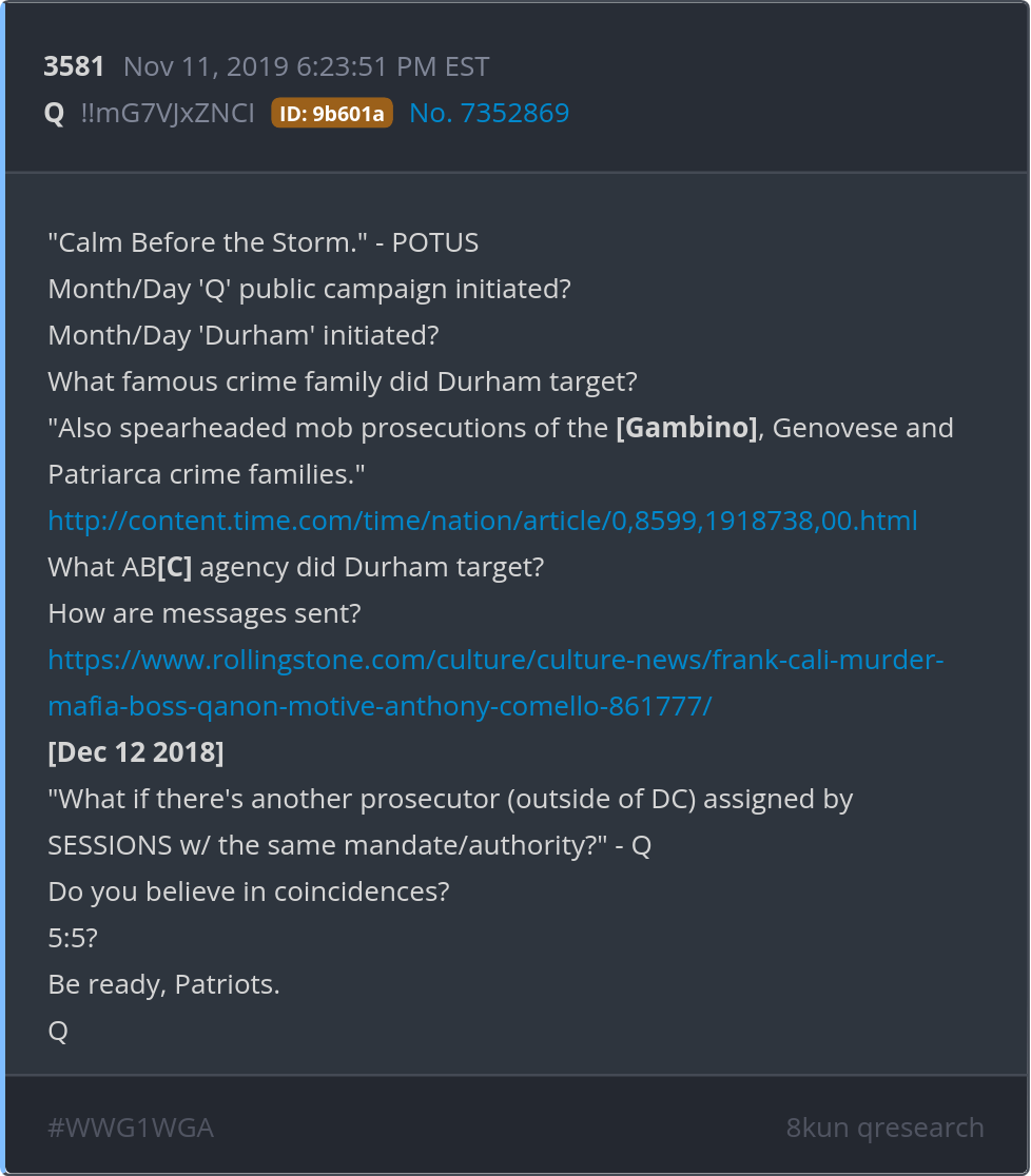 What famous crime family did Durham target? "Also spearheaded mob prosecutions of the [Gambino], Genovese and Patriarca crime families." http://content.time.com/time/nation/article/0,8599,1918738,00.html https://www.rollingstone.com/culture/culture-news/frank-cali-murder-mafia-boss-qanon-motive-anthony-comello-861777/ Posted 11/10/2025 08:03 PM Categories Clips, Q