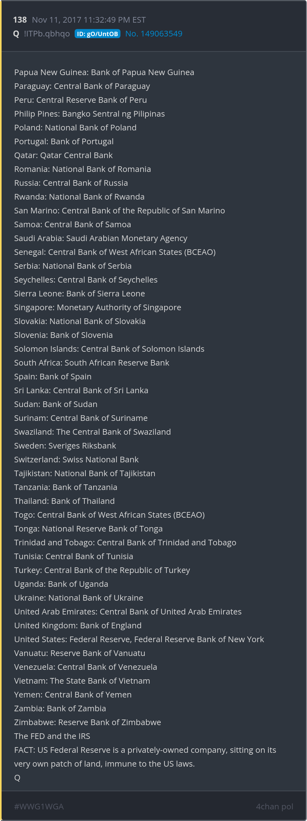 The FED and the IRS FACT: US Federal Reserve is a privately-owned company, sitting on its very own patch of land, immune to the US laws. Posted 11/10/2025 08:17 PM Categories Clips, Q