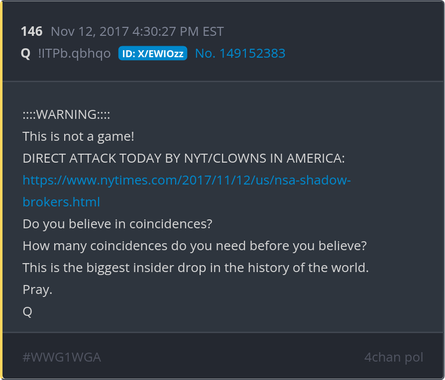Do you believe in coincidences? How many coincidences do you need before you believe? This is the biggest insider drop in the history of the world. Pray. https://www.nytimes.com/2017/11/12/us/nsa-shadow-brokers.html Posted 11/11/2025 08:01 PM Categories Clips, Q