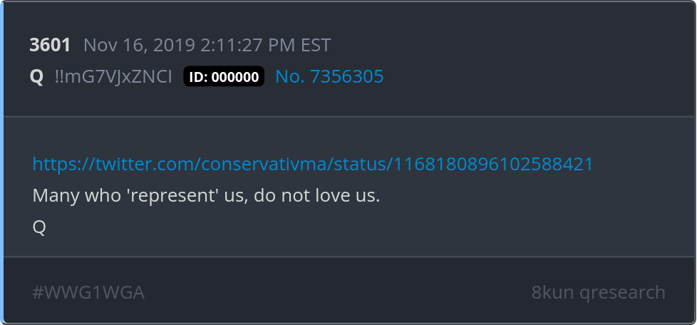 Many who 'represent' us, do not love us. https://twitter.com/conservativma/status/1168180896102588421 Posted 11/15/2025 07:46 PM Categories Clips, Q