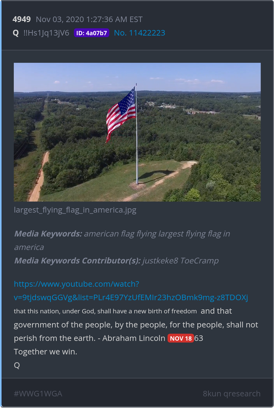 that this nation, under God, shall have a new birth of freedom and that government of the people, by the people, for the people, shall not perish from the earth. - Abraham Lincoln NOV 1863 Together we win. https://www.youtube.com/watch?v=9tjdswqGGVg&list=PLr4E97YzUfEMIr23hzOBmk9mg-z8TDOXj Posted 11/17/2025 07:58 PM Categories Clips, Q