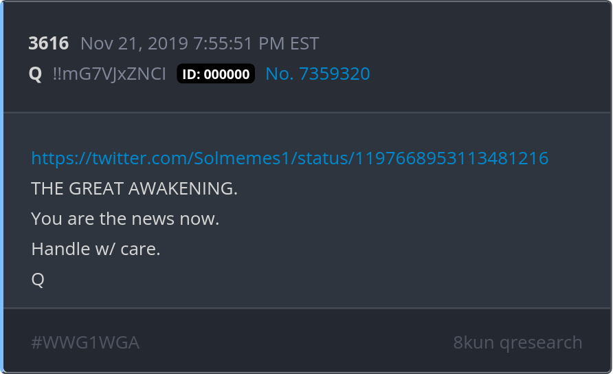 THE GREAT AWAKENING. You are the news now. Handle w/ care. https://twitter.com/Solmemes1/status/1197668953113481216 Posted 11/20/2025 07:59 PM Categories Clips, Q