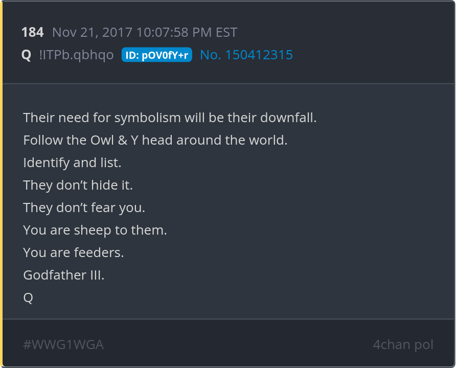 Their need for symbolism will be their downfall. Follow the Owl & Y head around the world. Identify and list. They don’t hide it. They don’t fear you. You are sheep to them. You are feeders. Posted 11/20/2025 08:07 PM Categories Clips, Q