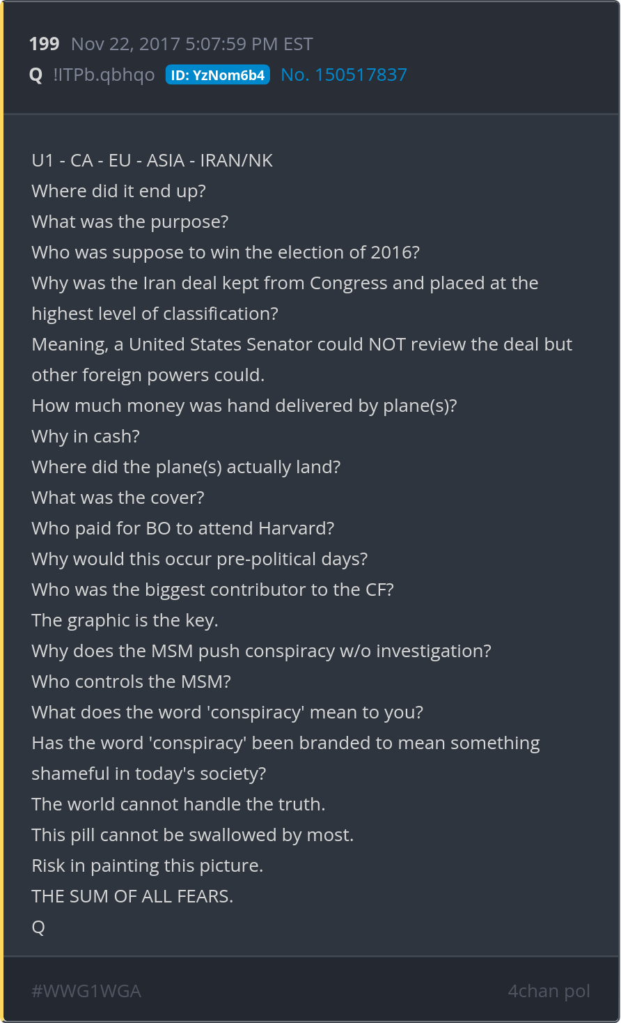 The world cannot handle the truth. This pill cannot be swallowed by most. Risk in painting this picture. THE SUM OF ALL FEARS. Posted 11/21/2025 08:11 PM Categories Clips, Q
