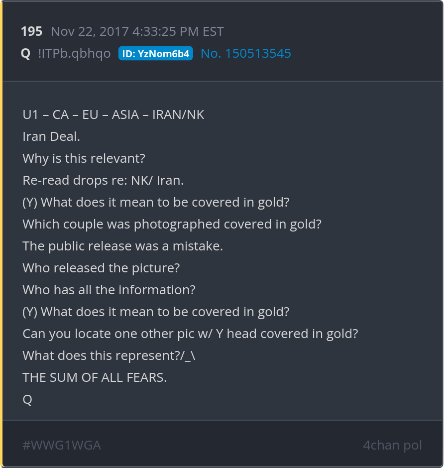 (Y) What does it mean to be covered in gold? Which couple was photographed covered in gold? The public release was a mistake. Who released the picture? Who has all the information? Posted 11/21/2025 08:13 PM Categories Clips, Q