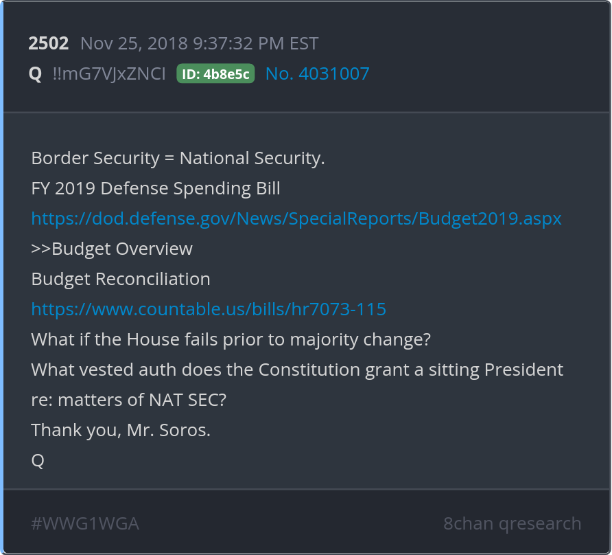 What vested auth does the Constitution grant a sitting President re: matters of NAT SEC? Thank you, Mr. Soros. https://dod.defense.gov/News/SpecialReports/Budget2019.aspx https://www.countable.us/bills/hr7073-115 Posted 11/24/2025 08:35 PM Categories Clips, Q