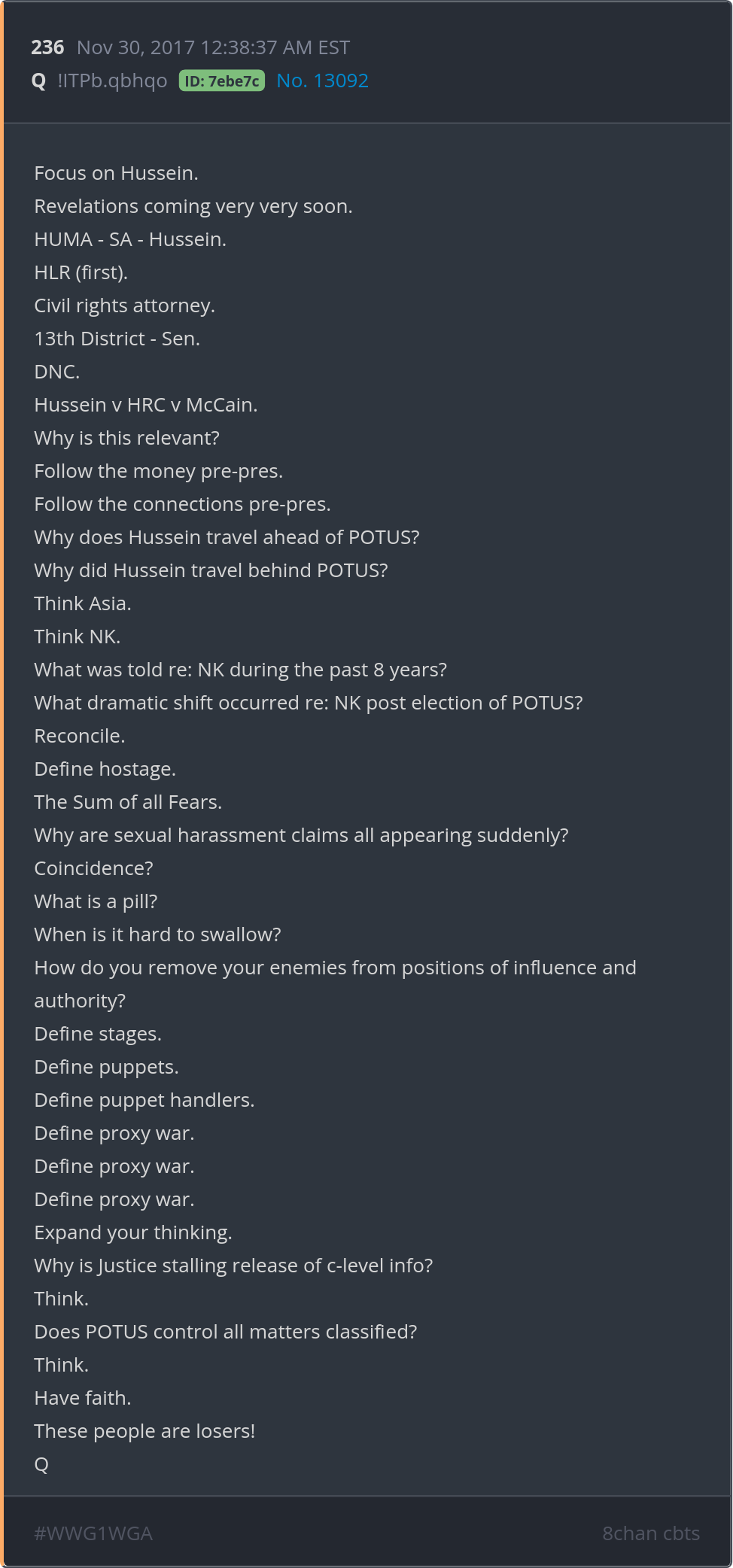 Why is Justice stalling release of c-level info? Think. Does POTUS control all matters classified? Think. Have faith. These people are losers! Posted 11/29/2025 08:00 PM Categories Clips, Q