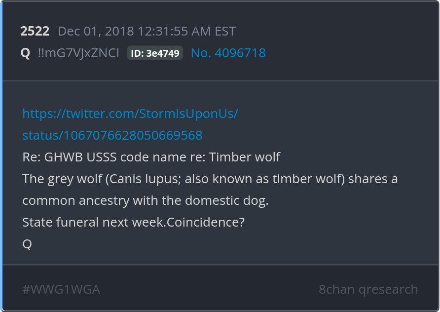 Re: GHWB USSS code name re: Timber wolf The grey wolf (Canis lupus; also known as timber wolf) shares a common ancestry with the domestic dog. https://twitter.com/StormIsUponUs/status/1067076628050669568 Posted 11/30/2025 08:18 PM Categories Clips, Q