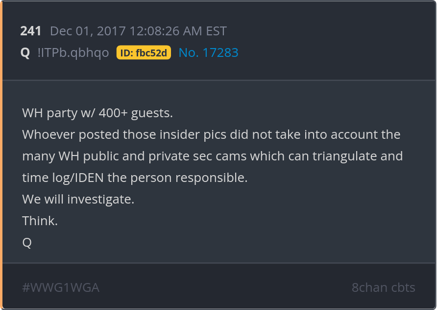 Whoever posted those insider pics did not take into account the many WH public and private sec cams which can triangulate and time log/IDEN the person responsible. We will investigate. Think. Posted 11/30/2025 08:23 PM Categories Clips, Q