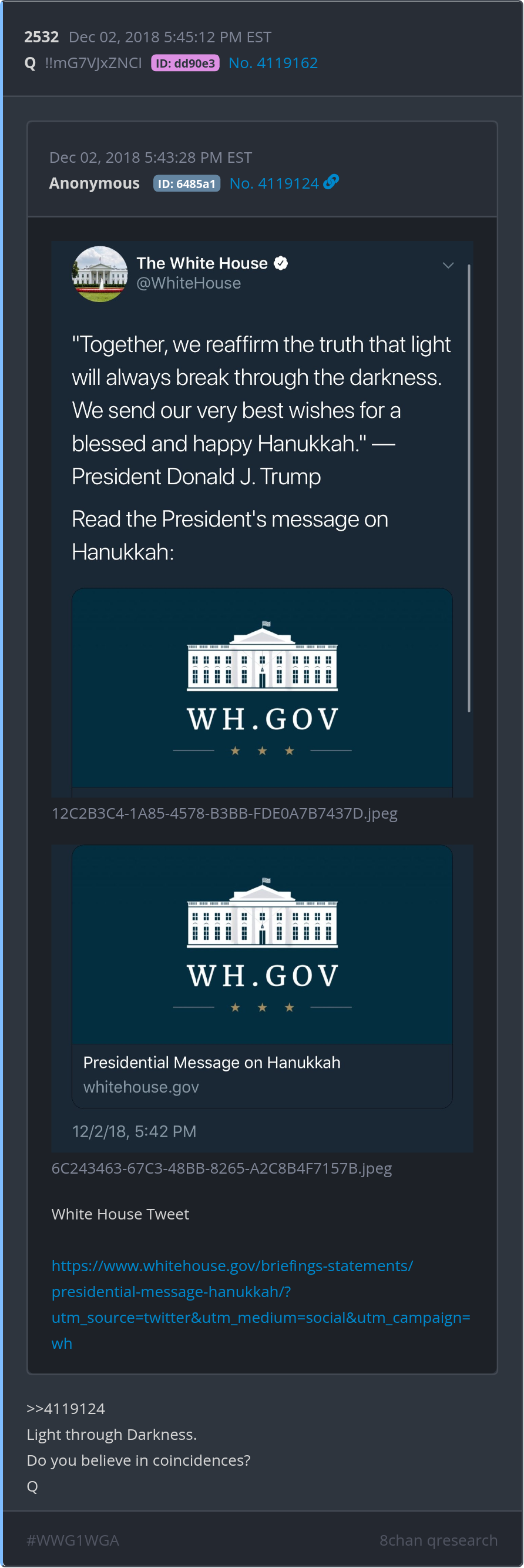 White House Tweet https://www.whitehouse.gov/briefings-statements/presidential-message-hanukkah/?utm_source=twitter&utm_medium=social&utm_campaign=wh Posted 12/01/2025 08:03 PM Categories Clips, Q