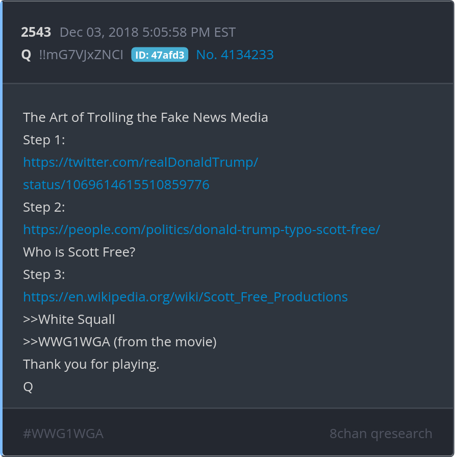 The Art of Trolling the Fake News Media https://twitter.com/realDonaldTrump/status/1069614615510859776 https://people.com/politics/donald-trump-typo-scott-free/ https://en.wikipedia.org/wiki/Scott_Free_Productions Posted 12/02/2025 08:35 PM Categories Clips, Q