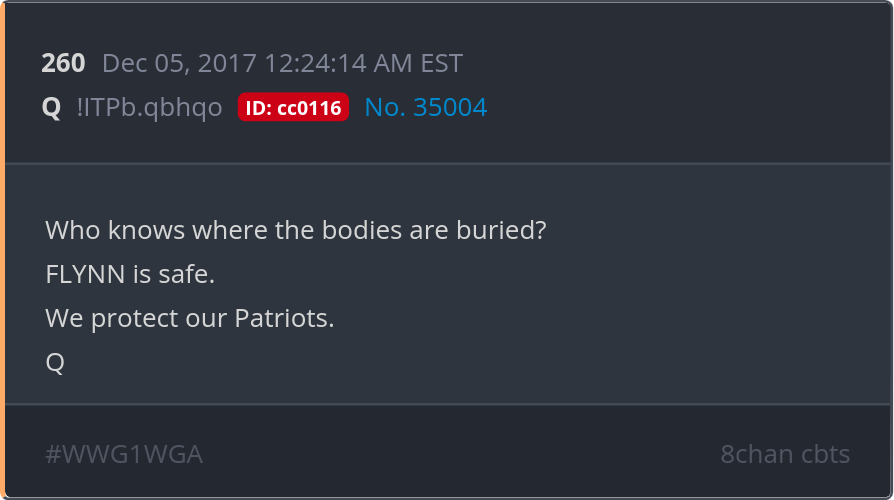 Who knows where the bodies are buried? FLYNN is safe. We protect our Patriots. Posted 12/04/2025 08:29 PM Categories Clips, Q