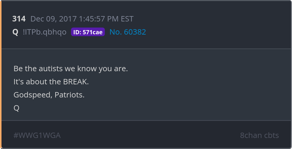 Be the autists we know you are. It's about the BREAK. Godspeed, Patriots. Posted 12/08/2025 08:20 PM Categories Clips, Q