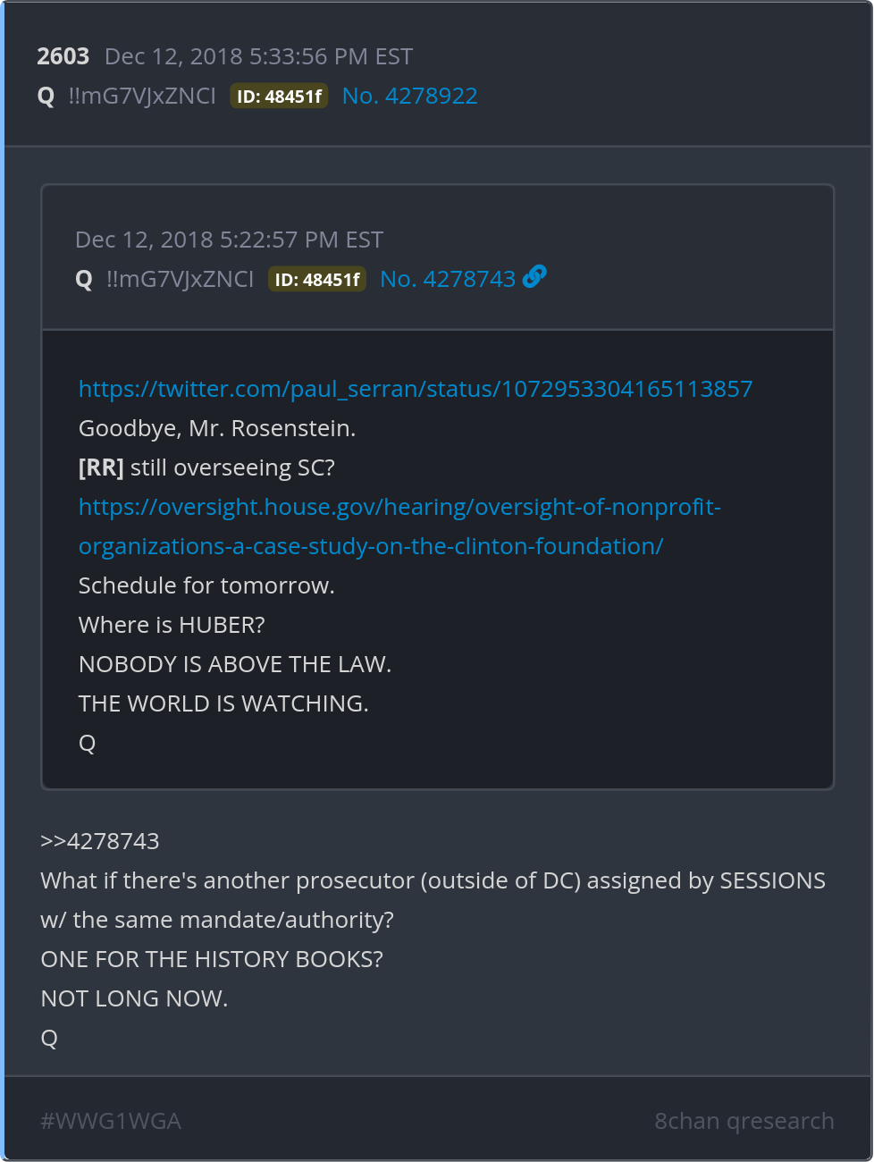 What if there's another prosecutor (outside of DC) assigned by SESSIONS w/ the same mandate/authority? ONE FOR THE HISTORY BOOKS? NOT LONG NOW. https://twitter.com/paul_serran/status/1072953304165113857 https://oversight.house.gov/hearing/oversight-of-nonprofit-organizations-a-case-study-on-the-clinton-foundation/ Posted 12/11/2025 08:15 PM Categories Clips, Q