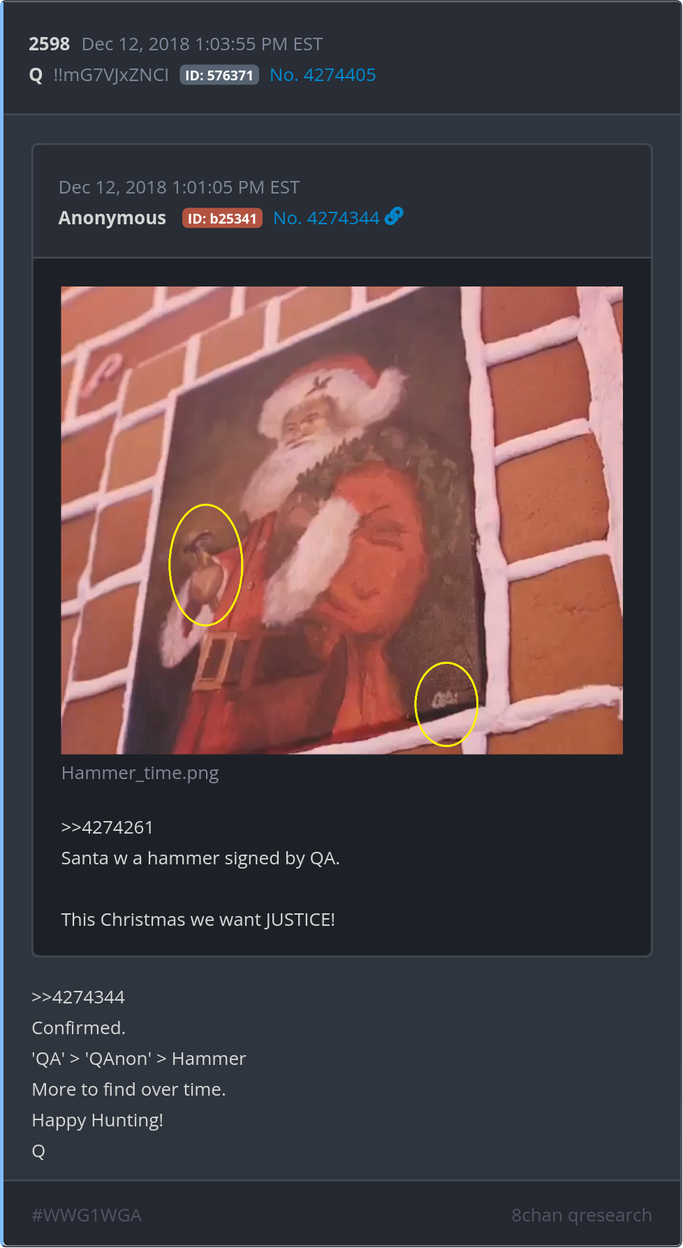 Santa w a hammer signed by QA. This Christmas we want JUSTICE! Posted 12/11/2025 08:18 PM Categories Clips, Q