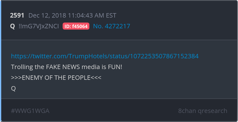 Trolling the FAKE NEWS media is FUN! >>>ENEMY OF THE PEOPLE<<< https://twitter.com/TrumpHotels/status/1072253507867152384 Posted 12/11/2025 08:21 PM Categories Clips, Q