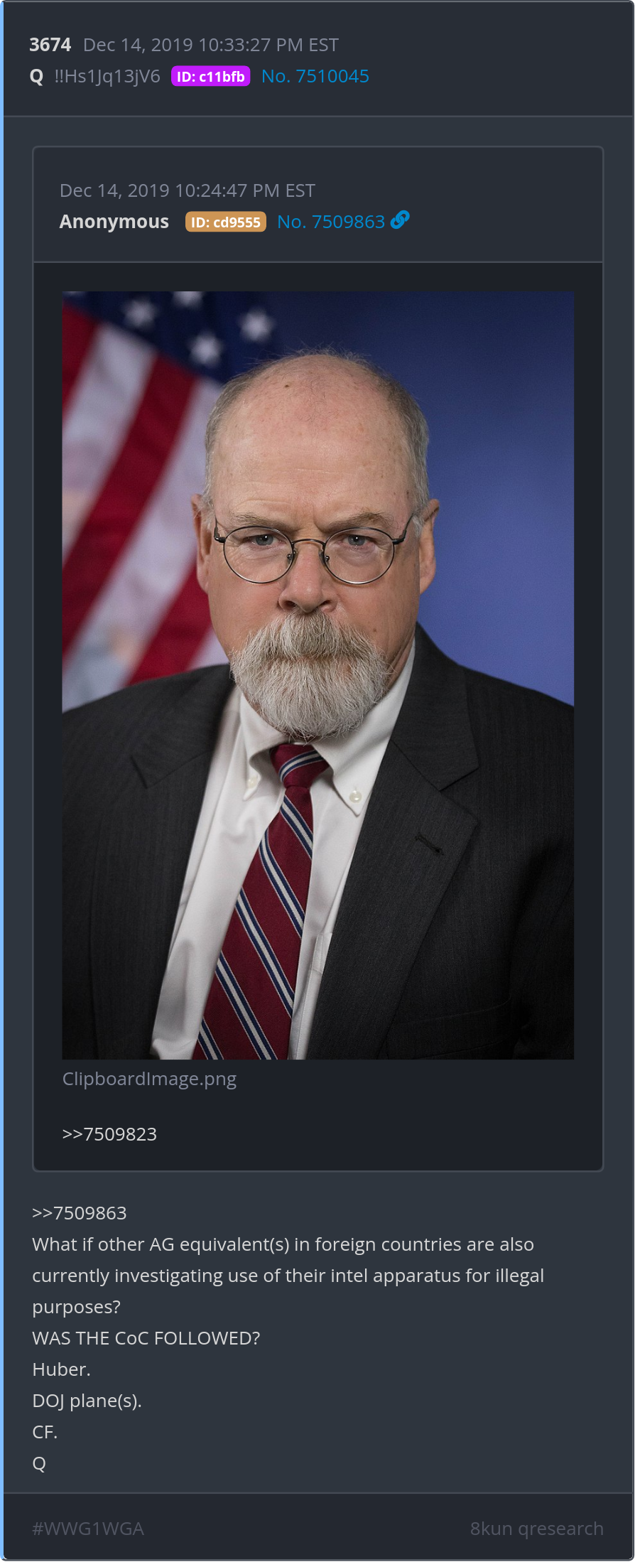 What if other AG equivalent(s) in foreign countries are also currently investigating use of their intel apparatus for illegal purposes? WAS THE CoC FOLLOWED? Huber. DOJ plane(s). CF. Posted 12/13/2025 08:35 PM Categories Clips, Q