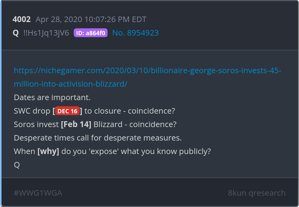 Desperate times call for desperate measures. When [why] do you 'expose' what you know publicly? https://nichegamer.com/2020/03/10/billionaire-george-soros-invests-45-million-into-activision-blizzard/ Posted 12/15/2025 08:21 PM Categories Clips, Q