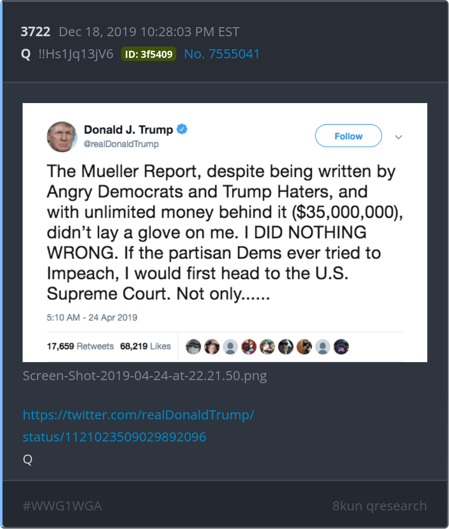 Mueller Report https://twitter.com/realDonaldTrump/status/1121023509029892096 Posted 12/17/2025 08:02 PM Categories Clips, Q