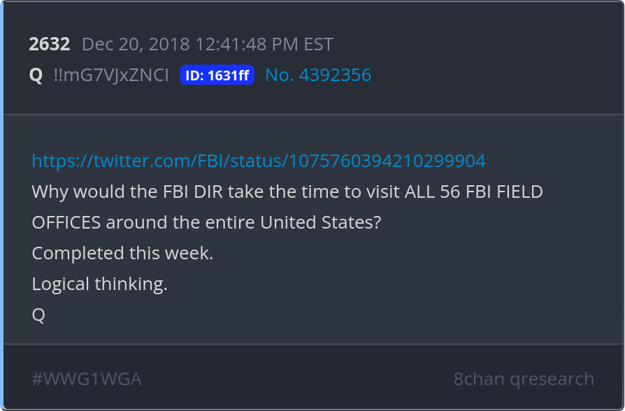 Why would the FBI DIR take the time to visit ALL 56 FBI FIELD OFFICES around the entire United States? Completed this week. Logical thinking. https://twitter.com/FBI/status/1075760394210299904 Posted 12/19/2025 08:38 PM Categories Clips, Q