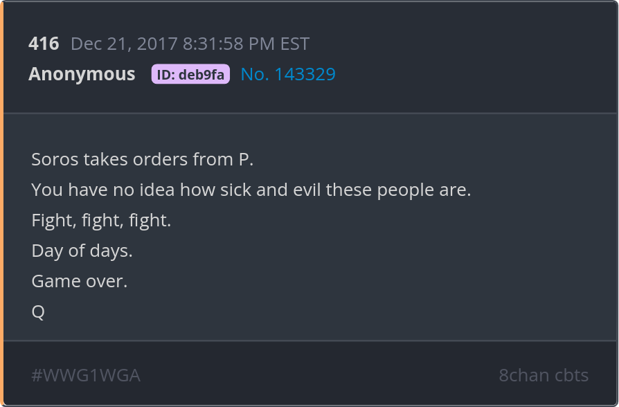 Soros takes orders from P. You have no idea how sick and evil these people are. Fight, fight, fight. Day of days. Game over. Posted 12/20/2025 08:17 PM Categories Clips, Q
