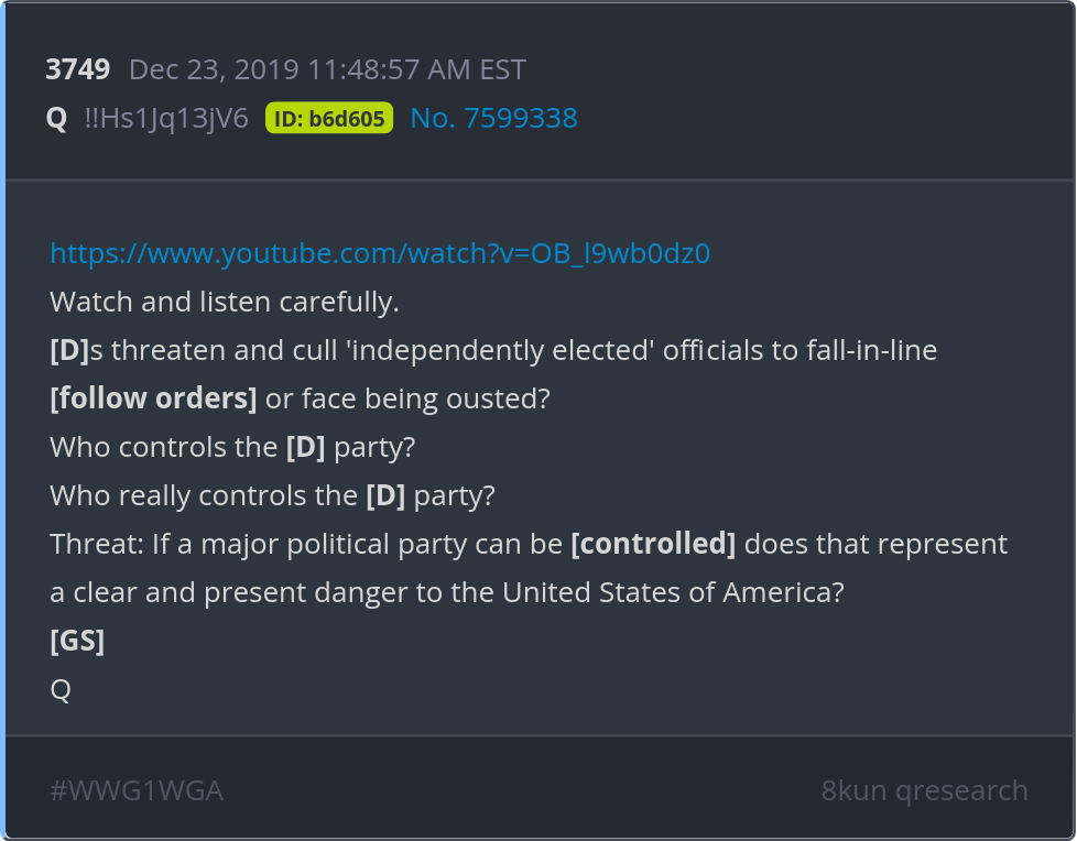 Who controls the [D] party? Who really controls the [D] party? Threat: If a major political party can be [controlled] does that represent a clear and present danger to the United States of America? [GS] https://www.youtube.com/watch?v=OB_l9wb0dz0 Posted 12/22/2025 08:13 PM Categories Clips, Q