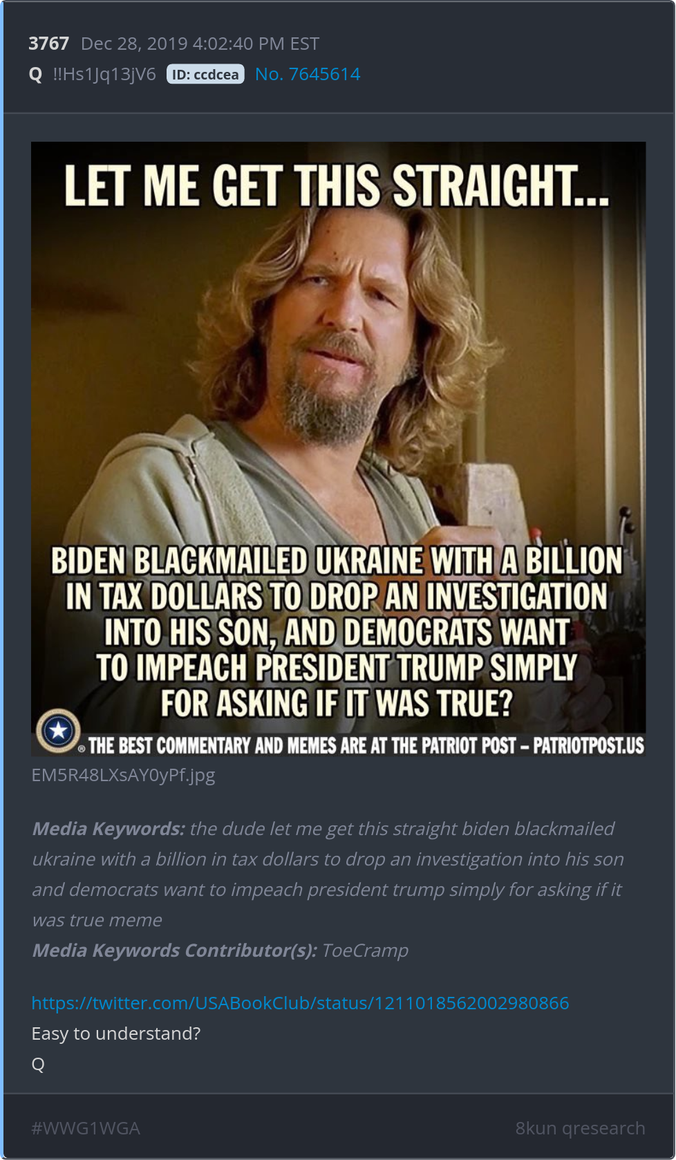 biden blackmailed ukraine with a billion in tax dollars to drop an investigation into his son and democrats want to impeach president trump simply for asking if it was true https://twitter.com/USABookClub/status/1211018562002980866 Posted 12/27/2025 08:36 PM Categories Clips, Q