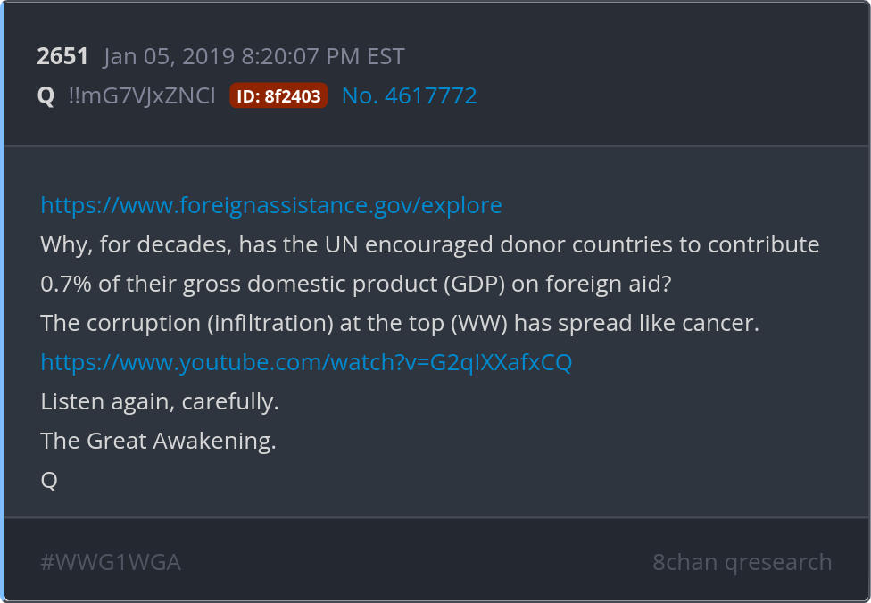 Listen again, carefully. The Great Awakening. https://www.foreignassistance.gov/explore https://www.youtube.com/watch?v=G2qIXXafxCQ Posted 01/04/2026 08:13 PM Categories Clips, Q