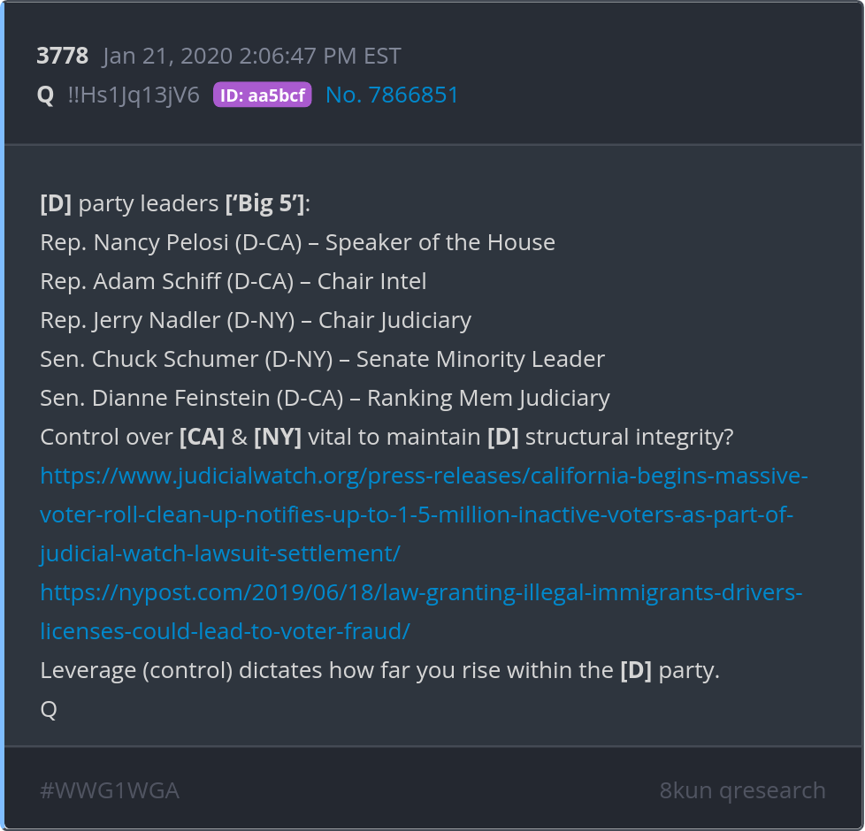Leverage (control) dictates how far you rise within the [D] party. https://www.judicialwatch.org/press-releases/california-begins-massive-voter-roll-clean-up-notifies-up-to-1-5-million-inactive-voters-as-part-of-judicial-watch-lawsuit-settlement/ https://nypost.com/2019/06/18/law-granting-illegal-immigrants-drivers-licenses-could-lead-to-voter-fraud/ Posted 01/20/2026 08:34 PM Categories Clips, Q
