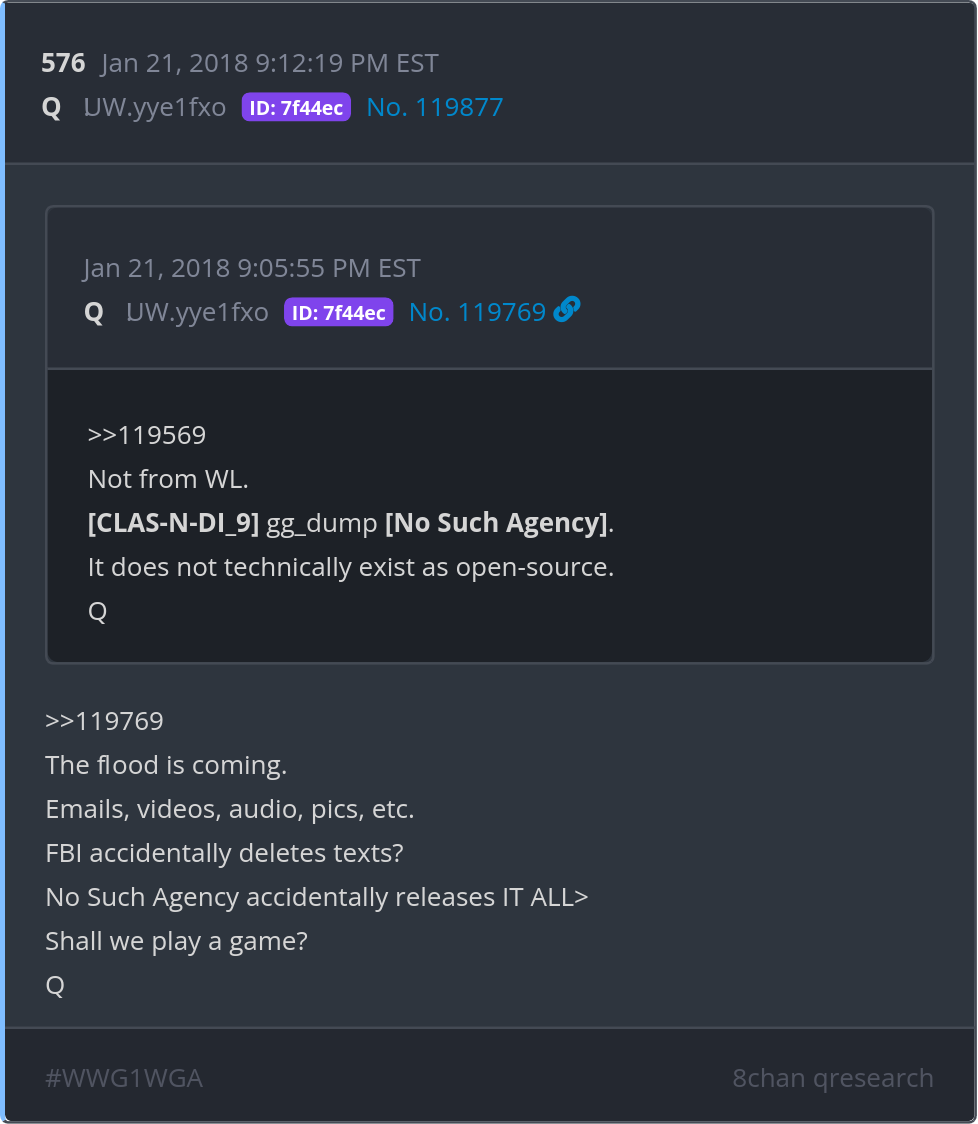 The flood is coming. Emails, videos, audio, pics, etc. FBI accidentally deletes texts? No Such Agency accidentally releases IT ALL> Shall we play a game? Posted 01/20/2026 08:37 PM Categories Clips, Q