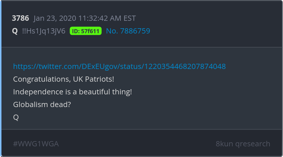 Globalism dead? https://twitter.com/DExEUgov/status/1220354468207874048 Posted 01/22/2026 08:17 PM Categories Clips, Q