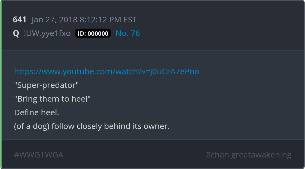 "Super-predator" "Bring them to heel" Define heel. (of a dog) follow closely behind its owner. https://www.youtube.com/watch?v=j0uCrA7ePno Posted 01/26/2026 08:22 PM Categories Clips, Q