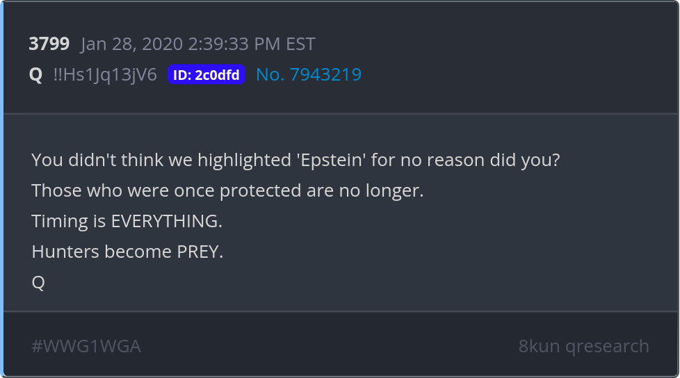 You didn't think we highlighted 'Epstein' for no reason did you? Those who were once protected are no longer. Timing is EVERYTHING. Hunters become PREY. Posted 01/27/2026 08:01 PM Categories Clips, Q