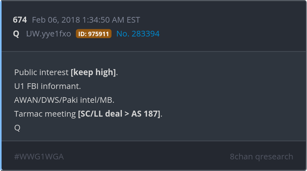 Public interest [keep high]. U1 FBI informant. AWAN/DWS/Paki intel/MB. Tarmac meeting [SC/LL deal > AS 187]. Posted 02/05/2026 08:12 PM Categories Clips, Q