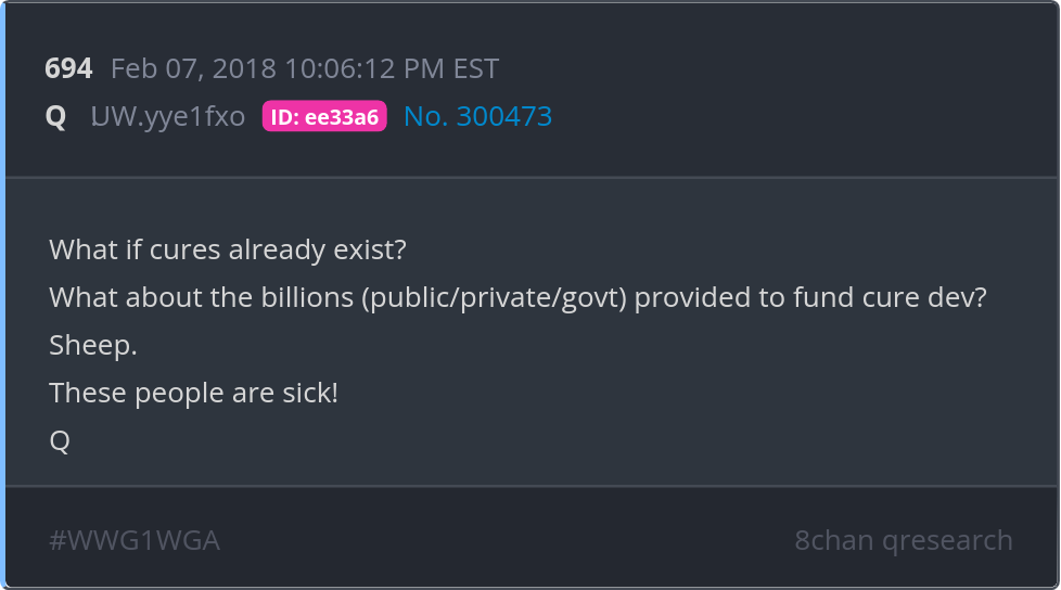 What if cures already exist? What about the billions (public/private/govt) provided to fund cure dev? Sheep. These people are sick! Posted 02/06/2026 07:47 PM Categories Clips, Q
