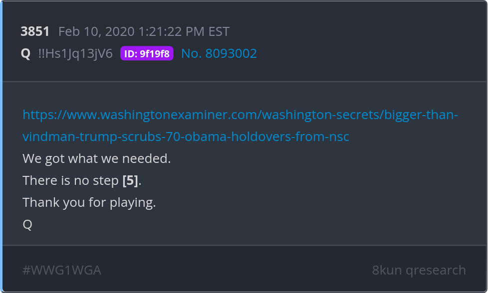 We got what we needed. There is no step [5]. Thank you for playing. https://www.washingtonexaminer.com/washington-secrets/bigger-than-vindman-trump-scrubs-70-obama-holdovers-from-nsc Posted 02/09/2026 07:46 PM Categories Clips, Q