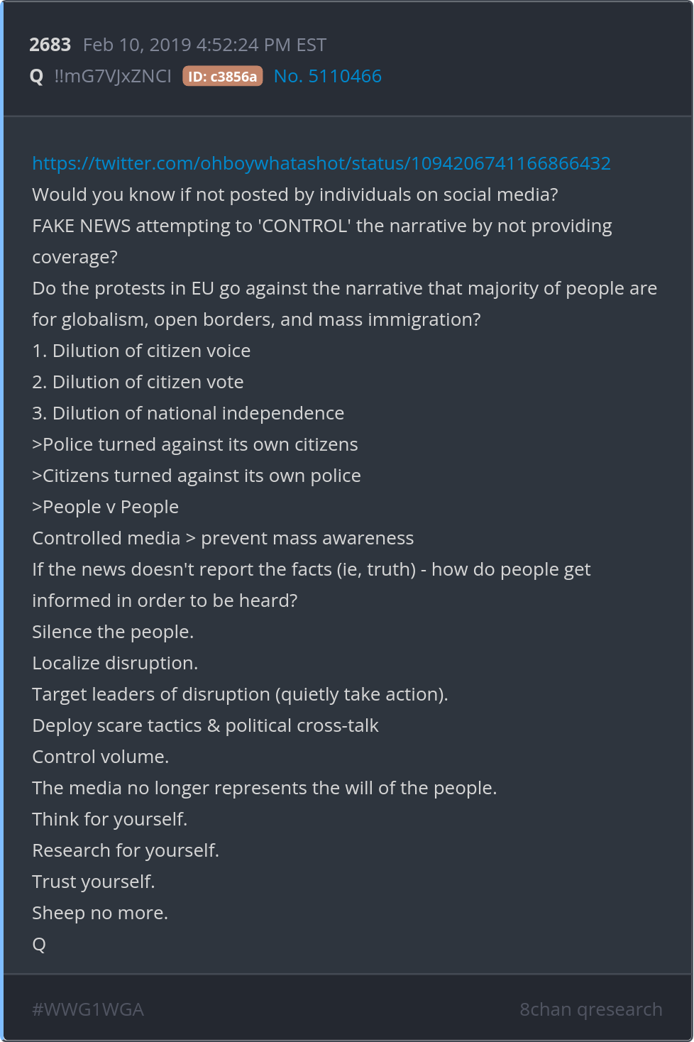 The media no longer represents the will of the people. Think for yourself. Research for yourself. Trust yourself. Sheep no more. https://twitter.com/ohboywhatashot/status/1094206741166866432 Posted 02/09/2026 07:55 PM Categories Clips, Q