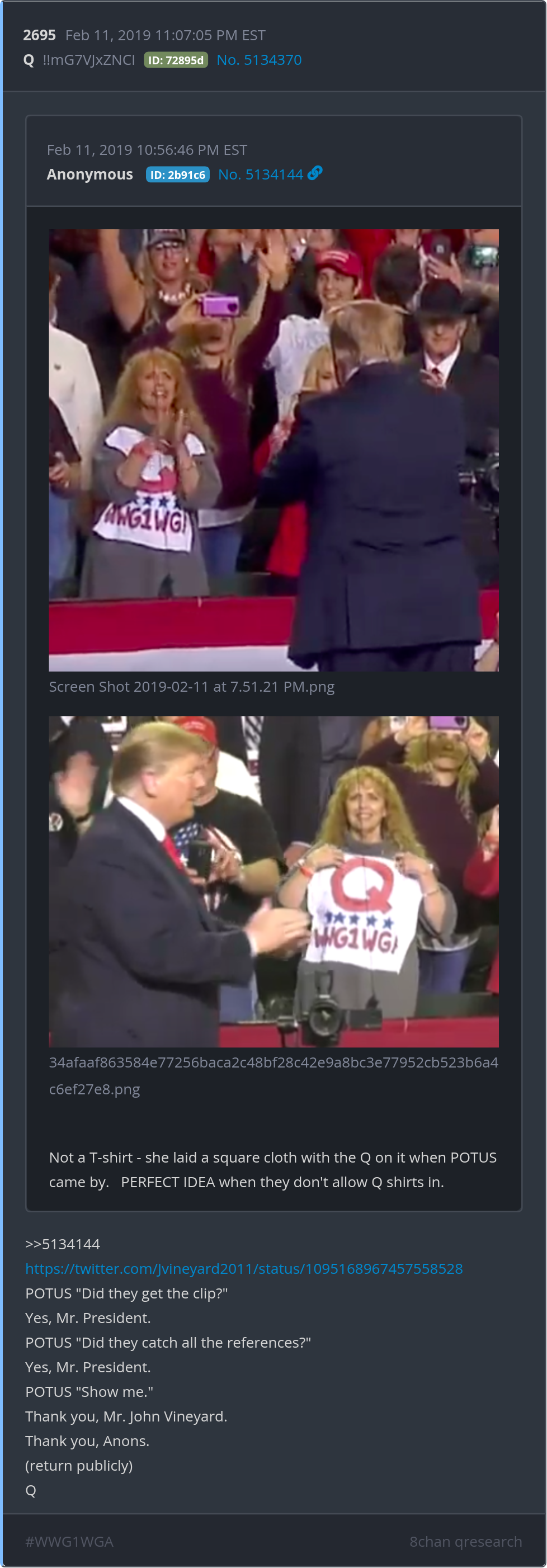 POTUS "Did they get the clip?" Yes, Mr. President. POTUS "Did they catch all the references?" Yes, Mr. President. https://twitter.com/Jvineyard2011/status/1095168967457558528 Posted 02/10/2026 07:48 PM Categories Clips, Q