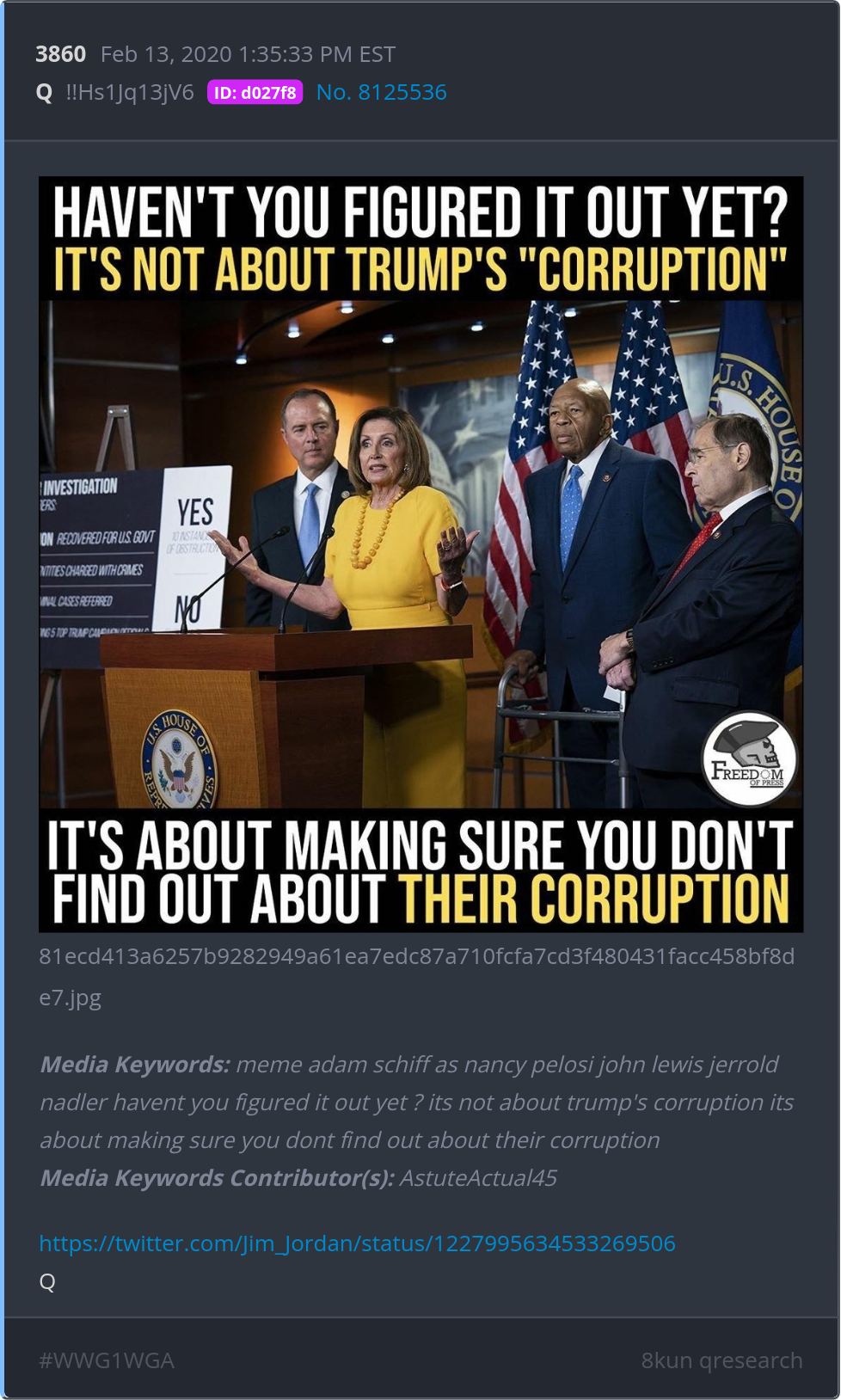 Its not about trump's corruption its about making sure you dont find out about their corruption https://twitter.com/Jim_Jordan/status/1227995634533269506 Posted 02/12/2026 08:25 PM Categories Clips, Q