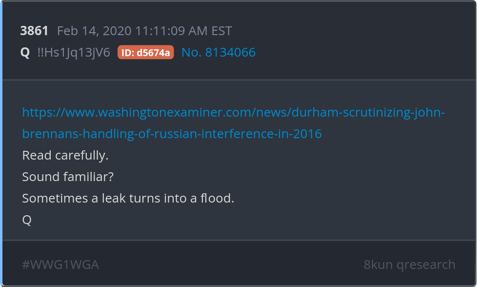 Sometimes a leak turns into a flood. https://www.washingtonexaminer.com/news/durham-scrutinizing-john-brennans-handling-of-russian-interference-in-2016 Posted 02/13/2026 08:51 PM Categories Clips, Q