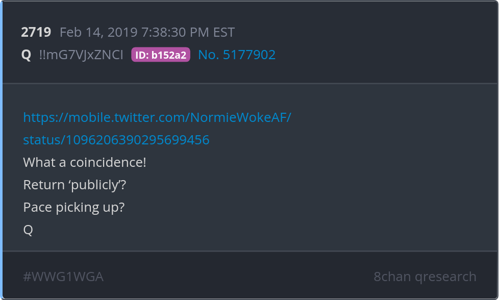 What a coincidence! Return ‘publicly’? Pace picking up? https://mobile.twitter.com/NormieWokeAF/status/1096206390295699456 Posted 02/13/2026 08:59 PM Categories Clips, Q