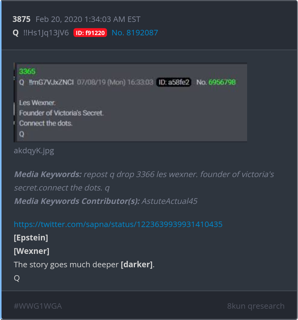 [Epstein] [Wexner] The story goes much deeper [darker]. https://twitter.com/sapna/status/1223639939931410435 Posted 02/19/2026 08:00 PM Categories Clips, Q