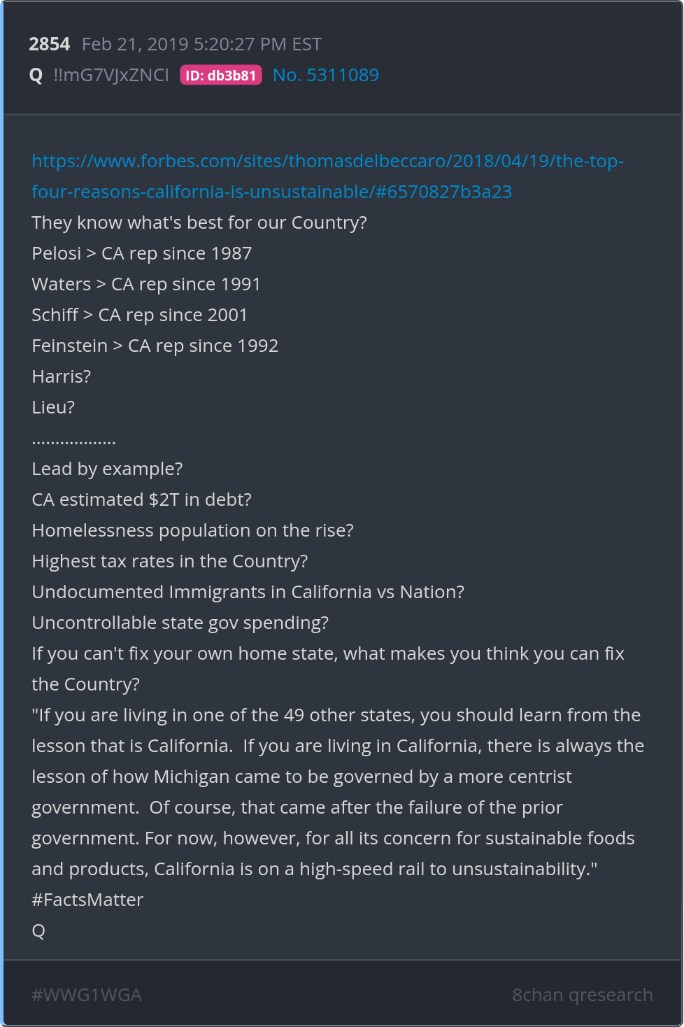 They know what's best for our Country? https://www.forbes.com/sites/thomasdelbeccaro/2018/04/19/the-top-four-reasons-california-is-unsustainable/#6570827b3a23 Posted 02/20/2026 08:50 PM Categories Clips, Q