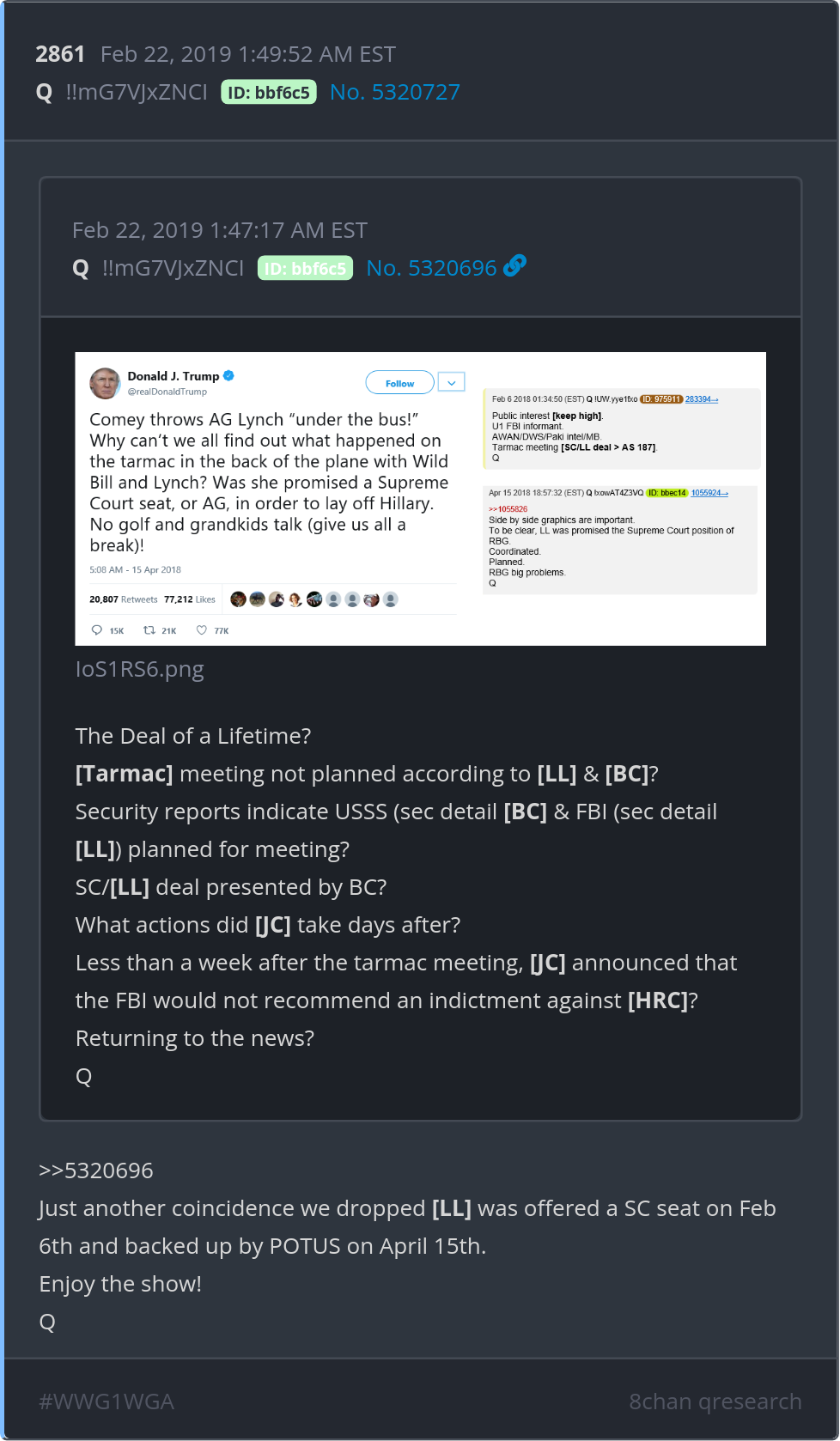 Just another coincidence we dropped [LL] was offered a SC seat on Feb 6th and backed up by POTUS on April 15th. Enjoy the show! Posted 02/21/2026 08:52 PM Categories Clips, Q