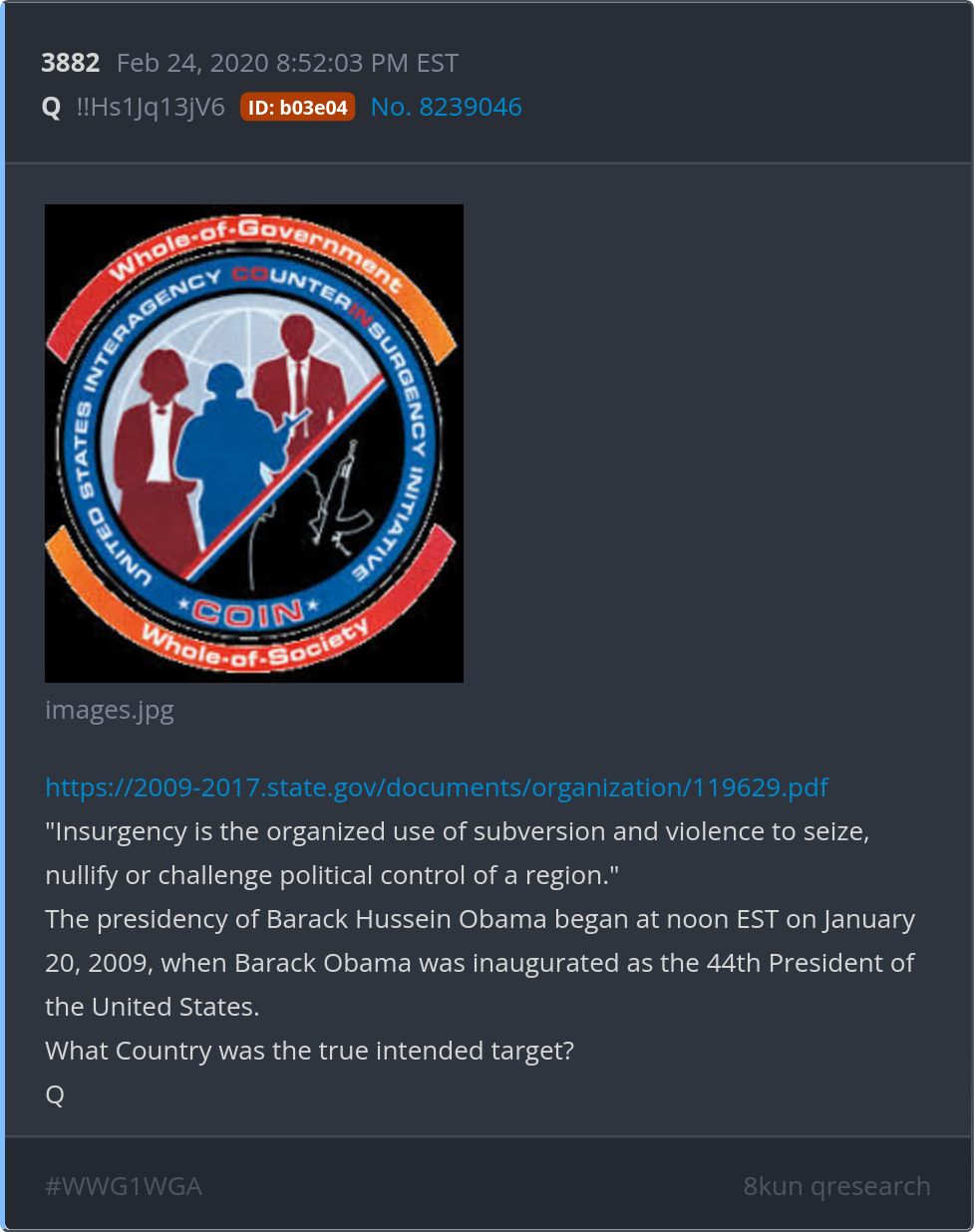 "Insurgency is the organized use of subversion and violence to seize, nullify or challenge political control of a region." https://2009-2017.state.gov/documents/organization/119629.pdf Posted 02/23/2026 08:17 PM Categories Clips, Q