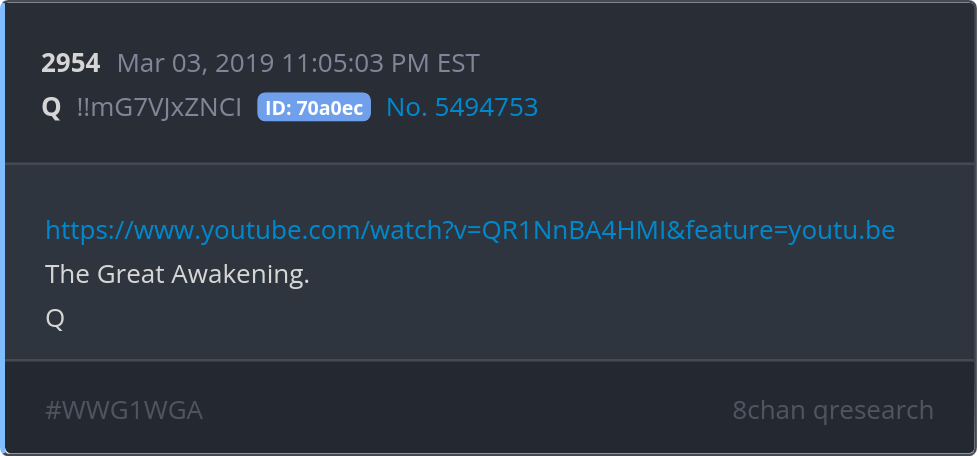 The Great Awakening. https://www.youtube.com/watch?v=QR1NnBA4HMI&feature=youtu.be Posted 03/02/2026 07:55 PM Categories Clips, Q