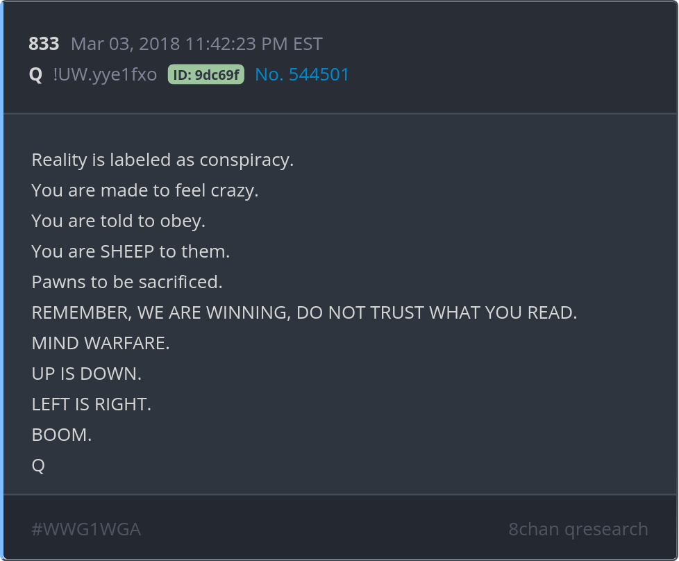REMEMBER, WE ARE WINNING, DO NOT TRUST WHAT YOU READ. MIND WARFARE. UP IS DOWN. LEFT IS RIGHT. BOOM. Posted 03/02/2026 08:02 PM Categories Clips, Q