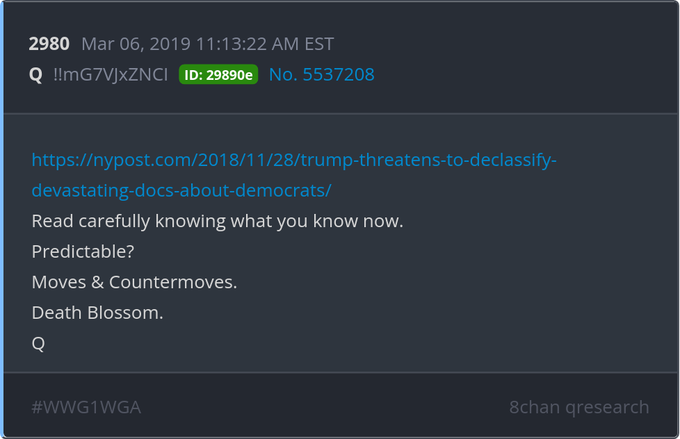 Read carefully knowing what you know now. Predictable? Moves & Countermoves. Death Blossom. https://nypost.com/2018/11/28/trump-threatens-to-declassify-devastating-docs-about-democrats/ Posted 03/05/2026 08:07 PM Categories Clips, Q