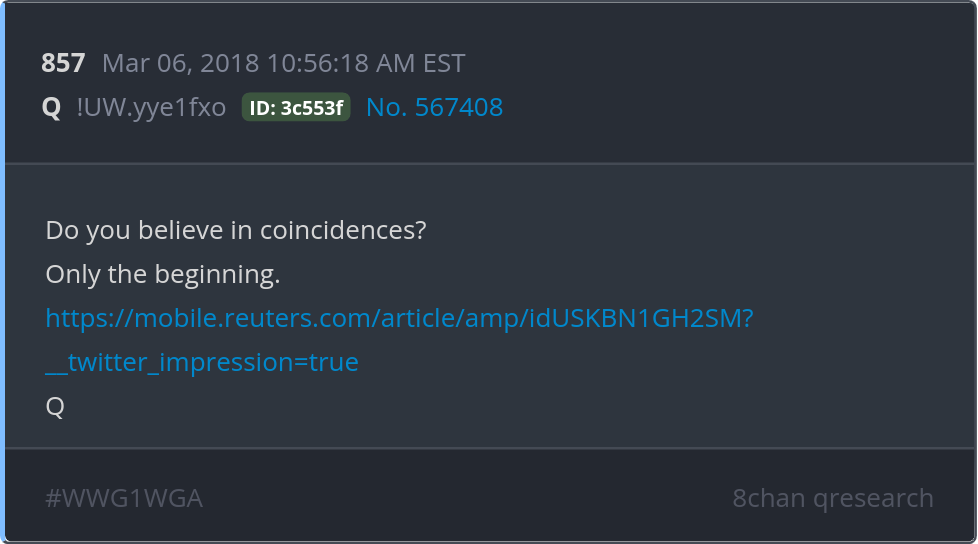 Do you believe in coincidences? Only the beginning. https://mobile.reuters.com/article/amp/idUSKBN1GH2SM?__twitter_impression=true Posted 03/05/2026 08:14 PM Categories Clips, Q